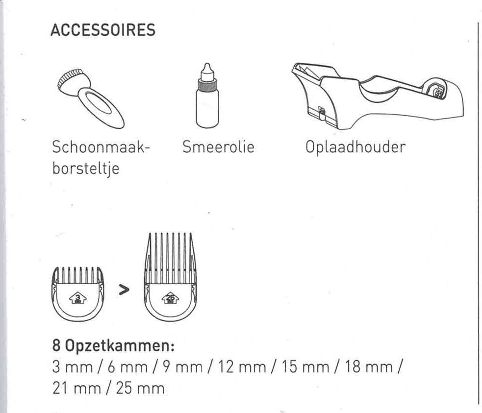 De tondeuse heeft 4 elektrisch instelbare snijlengtes van 1, 1.3, 1.6 en 1.9mm. Met slechts één klik heb je de gewenste lengte ingesteld. Daarnaast worden er ook 8 opzetkammen bijgeleverd van 3, 6, 9, 12, 15, 18, 21 en 25mm.